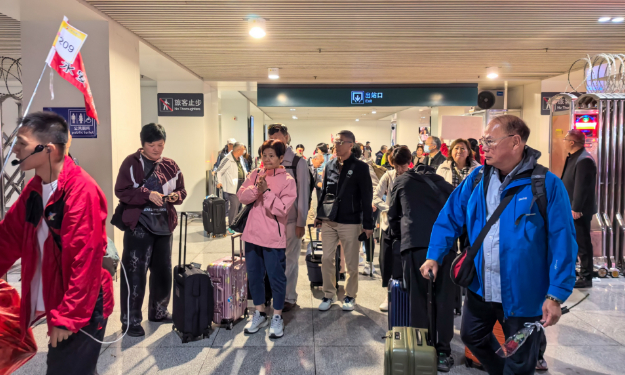 4月3日中午,郴州西站出站口热闹非凡,随着300名香港游客乘高铁顺利抵达,亲切的问候与欢快的腰鼓声交织回荡。